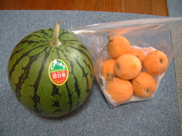 頂き物の西瓜とびわです。お召し上がれ(⌒‐⌒)