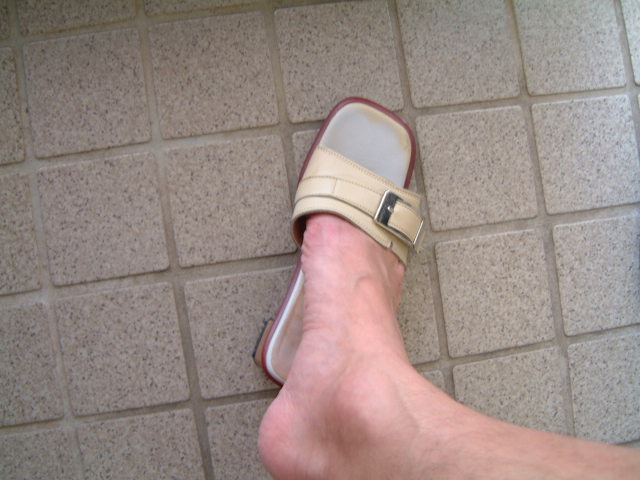 奥さんのサンダル履いてます! 奥さんはお出かけようの靴とサンダルをいつも玄関にセット! 私のはビジネスシューズのみセット。自分でサンダルだしといたら ・・ジャマだから靴箱にしまえだと・・・なにをっ・・・! という気持ちをぐっと堪えてます!だからちょっとの時は奥さんサンダルをpunchさんと同じようにちょんと履く! |