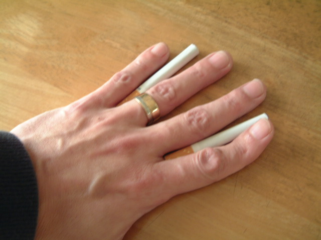 リンク先の Insomniaさん の記事を発端に各方面に飛び火! 他のブログでも、タバコで指の長さを比べる写真を見ることが・・・。 それで、私もやってみました。