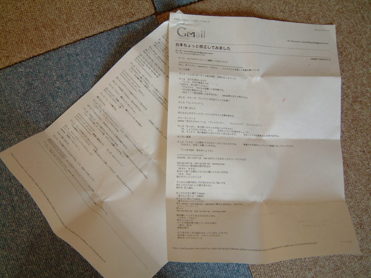 みなさん、動画は楽しんでいただけたでしょうか?w 完全なオヤジギャグですw いやぁー バカボン探すの大変でしたw 古本や行っても売ってないし そんな古いの滅多に入って来ないって言われて、急遽 ネットで探し回るw すげー長編になりそうなので、続きに書きますm(__)m もうライブまで2週間くらいしかないってのに、曲も全員 耳コピだしね。 当日のスタジオ練習の時が勝負だねなんて思ってたら、当日の練習が無理らしいと ナルセ君から連絡が入りwww リハが初あわせになるねとwww まあ、なんとかなるんでしょと楽観ムード ~―γ( ̄ο ̄)oΟ◯ そしたら、1週間前になって、どの音源を参考にすればいいのとナルセ君より質問 ??? 最初に曲が決まった時、youtubeの動画のこれを参考って渡したURL TV版なんで 曲が短いんでやんのwww 私は原曲で耳コピしてるしww 全員、尺がバラバラ? 急遽、参考音源を統一して、これで当日よろしくとwww 後はネタをどうするかなんだよなぁ~―γ( ̄ο ̄)oΟ◯ ライブまでもう3日くらいの時に、たまたま山口百恵の動画を見ててコピーしちゃって ライブの曲の練習しろよって、自分で突っ込んだりして・・・・・ ピーン 閃いた ネタだネタだ\(^o^)/ 早速、のっちさんにネタをメールする。「これで、いきましょうw」と返事が そして、原案を素に、修正台本が届く。これが、ライブ前日wwww 覚えられねぇよぉぉぉおwww 長すぎるよぉぉぉぉwww しかもネタはタイミングが命 前日の夜、のっちさんからのメールで 今回ナース役のゆっきーが患者役パジャマなので なにか、ぬいぐるみが欲しいとの依頼。犬なら私の所にあるよと用意・・・ 持って行く荷物を整理・・・ゲッ多すぎる・・・てか、ぬいぐるみデカすぎるw 完全に駐車場から歩くと 職質されるレベルwww しかし今回、一番人気の犬www ライブ後、みんなに愛されて、なかなか戻って来なかったw 娘に怒られちゃうでしょw 持って帰らないとwww そして、当日を向かえ プリズン東京へ到着 途中、職質も無し~―γ( ̄ο ̄)oΟ◯ みんなと挨拶交わしてるとのっちさんより、渡される台本w これが台本だよwww 前日に出来上がって、練習もなしw sakataさんと私とUGさんは楽屋へGOwww 台本のネタ確認と、みんな耳コピなんでギター2本はどうなる?みたいな 明菜とジュリーは問題ないようだなと確認。七瀬が私こうでしか覚えてきてないw ベースも一緒? 全員、このフレーズじゃんよとwww 修正修正ww そして、リハへ 初めて合わせるメンバーなのに、完璧すぎるww みんな余裕の表情(⌒‐⌒) 演奏だけなんで余計な事は考えなくてOKだし~―γ( ̄ο ̄)oΟ◯ のっちさんに、リハでネタ練習しちゃ駄目?と言うと、即答で駄目! ぶっつけ本番かよww ネタの事で頭が一杯なsakataさんと私www 何度も何度も台本を確認して頭に入れる。 本番直前でも、ネタの事で頭が一杯wwww そして、自らにプレッシャーをかける 私とsakataさん ネタはタイミングが命! そして、本番。 ドン引き? ゲッ! 頭の中は真っ白けwww やっぱり、練習は必要だよw ネタの部分は絶対にwww そう誓って、今回のライブは終了したのであったww 次回、ネタ強化 検査入院の方向で、みんなよろしく~―γ( ̄ο ̄)oΟ◯ でも、最高に楽しかったな。今回のライブw 動画で見ると、よくわかるw 全員が凄く楽しんで、ステージにいたことが 次回は日程、場所は未定だけれど、もう動き出している。 そして、私はネタ大王に ~―γ( ̄ο ̄)oΟ◯ PR |