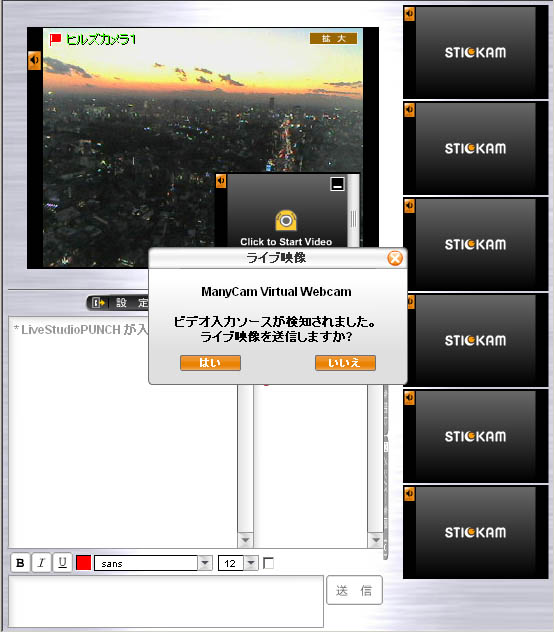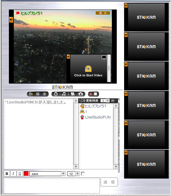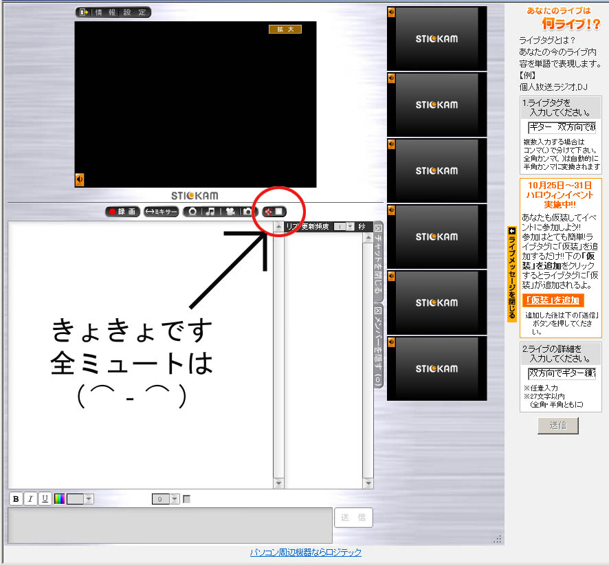 使い方がどうも分らない、音がでない等、まだ聞かれるので 一応、現段階までで分ってる事などをまとめてみました。(⌒‐⌒) ここを読めば、多分 大丈夫だと思うのでよろぴこです。 OSはWIN XP推奨ね。MACもOKだけど・・・。vistaは○んこです。 運悪くvistaの場合は、出来たらラッキーの方向で m(__)m WEBカメラ等は、自分で用意してね。 サイドバーに、アマゾンで売ってる一番安い奴を用途別にチョイスして 貼ってあるので、値段はそれで参考にしてください。 まずは下記で登録ね ライブカメラコミュニティー STICKAM ※18歳未満の場合は、友達同士でしか出来ないので、そこはまあ・・・で突破。 問題になるのが音がでてるのか、カメラは動作してるのか?ってこと。 そこで、イキナリ双方向で入る前にある程度チェックしてみてください。 自分でLIVEを開始してみれば、ある程度チェックできます。 やり方は下記の記事を参照下さい。 http://punch.blog.shinobi.jp/Entry/320/ えっ?カメラの映像が出てないの?ここはちゃんとチェックした? 設定だして、カメラを。 そこを選ばないと出ないよ ※カメラのバランス調整のソフトとかが起動しててもでないからね。 全部、終了させてからLIVE開始の方向で(⌒‐⌒) 音声は出てる!映像もOK!じゃOKか? いいえちょっと待って下さいね。 問題点があるので、ギター音だけなら簡単に音はでるんですよ。 殆どの人がBGMをPCで再生してギターを弾きますよね。 そのBGMとのMIXができるかが問題なんです。 ギターをPCのマイクまたはライン端子に接続してる場合 サウンドのプロパティーでWAVE MIXかステレオMIX呼び名がボードによって 違うのですが、そこにチェックが入ってないと駄目なのです。 分らない人は下記のHPを参考にしてみて下さい。 http://www.atamanikita.com/stereo_mix_00.html でけましたか?これでOKだと思います。心配でしたら、LIVE画面上の 録画ボタンを押して、BGMを流しながらギターを弾いて見て下さい。 それから、出来たファイルでちゃんと音が出てるか確認してみてください(⌒‐⌒) ※一部PCメーカーのサウンドボードではラインが認識しないものもあります。 ○ellとかね。私のPC 4台ともそうなの。うんこです。マイクに繋いで下さい。 MIXの項目もない?うんこ決定なので、私のように2台PCを使って下さい。 ※マイク端子に繋いだ場合、自分の音が聞こえな場合は、再生コントロールを 開きマイクの所にミュートが入ってないかご確認下さい。 PCのUSB接続でギターを繋いでる場合 これが、殆どの人が暗礁に乗り上げる難問なんですですね。 だってUSBの場合は、その音声しか乗せることができないから。 WAVE MIX等のサウンドが弄れませんので。ナムナム。 特にPODxtを使ってる方が多いのですが、USB接続は諦めて下さい。 BGMと一緒に音は出せないので、素直にマイクかライン端子に。 オーディオインターファイスの場合は、裏技を使って出す事が可能なことも。 外部入力端子が付いてるもの、そこへBGMを入れてあげればUSBでも BGMと一緒に出す事が可能です。 PCのスピーカー端子やヘッドフォン端子から、インターフェイスの外部入力へ。 インターフェイスのモニターアウトやヘッドフォンから聴いてみて下さい。 BGMとギターの音が聞こえますか?聞こえるならOK。中継で出せるはずです。 レベルが上がってない? 設定を出してマイクを選んで ここが、インターフェイスに選ばれて ないんじゃないのかな? ※インターフェイスにも色々あるのですが、バンドルソフトを起動させないと ギターの音が出せないものは、残念ですがBGMとのMIXが出来ない場合あり。 あくまでのインターフェイスのヘッドフォン端子からBGMが聞こえない状態では 中継にも音はのらないと思います。 LIVEの録画機能を使って、ご自分で出し方を考えてみてください。 ではいよいよ、双方向でライブスタジオPUNCHへ入る為には 私のStickamブログパーツの虫眼鏡アイコンをクリックして下さいね。 はいをクリックすればOKです。 他の演奏者の方の迷惑とならないように 自分のマイクをミュートしておくとベストですね。 様子見してからならいいえを。 初めての方はいいえで入ってから チャットで聞いてください。 いいえで入るとこんな感じです。 Click to Start Videoで後から 開始できますから 双方向では6名しか参加ができませんので、混んでる時等は 譲り合いでお願いします。また、混んでる時に長時間、席を外す場合など 自分の画面の×ボタンを押して下さい。その分、席が開きますので。 ※たまに、ご自分が双方向と知らずに入ってる方がおり、数時間放置されると 他の方が使えませんので、チャットのみ参加する方などは×で映像を 消して置いていただけると助かります。見てるだけの方は特にお願いします。 最悪、強制排除ボタンがあるのですが、あまり使いたくはないのでよろぴこ。 左側にマイクミュートありますので WAVE MIXで音が出てる方で 見てる時はミュートすると助かります 演奏する方、見てる方で新しい人が入ってきて